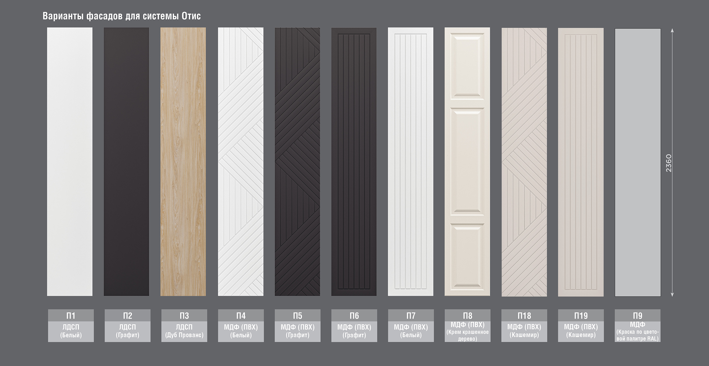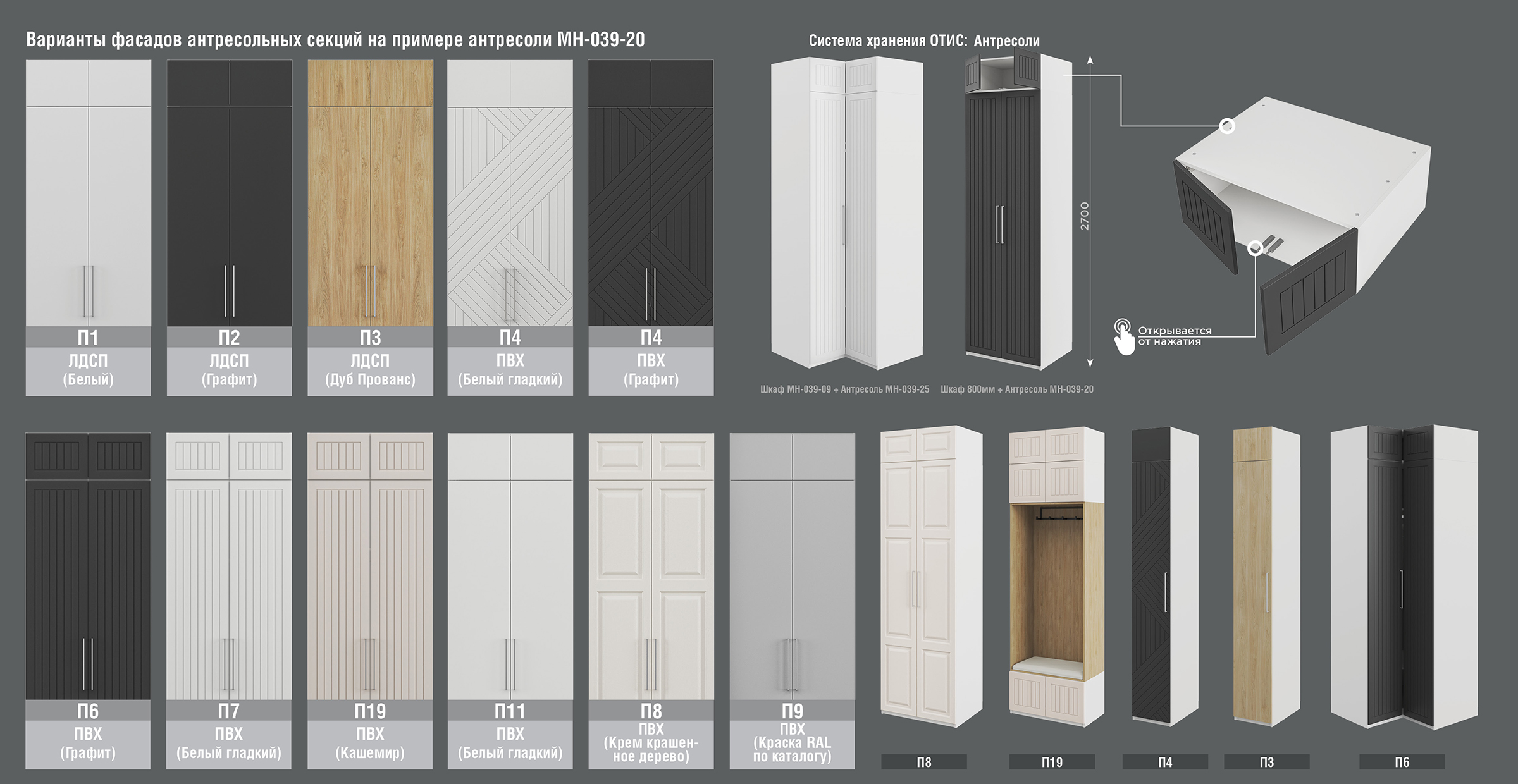 Серия модульных шкафов ОТИС - это современная система хранения, совмещающая в себе функциональность и стиль. Вы с лёгкостью сможете вписать эту систему в спальню, прихожую, кабинет, гардеробную комнату, а также в офис. Эта система позволяет легко комбинировать внутреннее наполнение за счёт разнообразия модулей, в зависимости от ваших потребностей и места размещения. В дополнение к линейке шкафов предусмотрен ряд стеллажей, которые дополнят внешний вид и функционал всей системы. Разнообразие фасадов позволит подобрать дизайн, подходящий вашему интерьеру.
